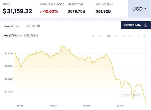 Сейчас биткоин торгуется на уровне 31159 долларов. Падение с начала нынешних суток составило 10,6%.