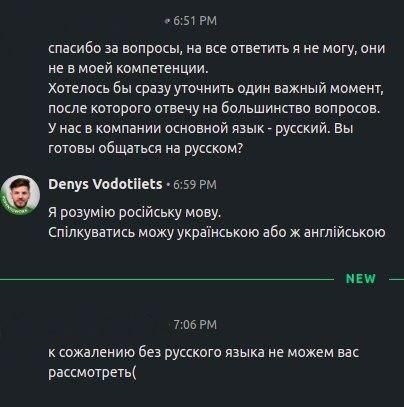 Напомним, о подобной ситуации также сообщалось в октябре прошлого года. Тогда в Киеве программисту отказали в собеседовании из-за украинского языка.