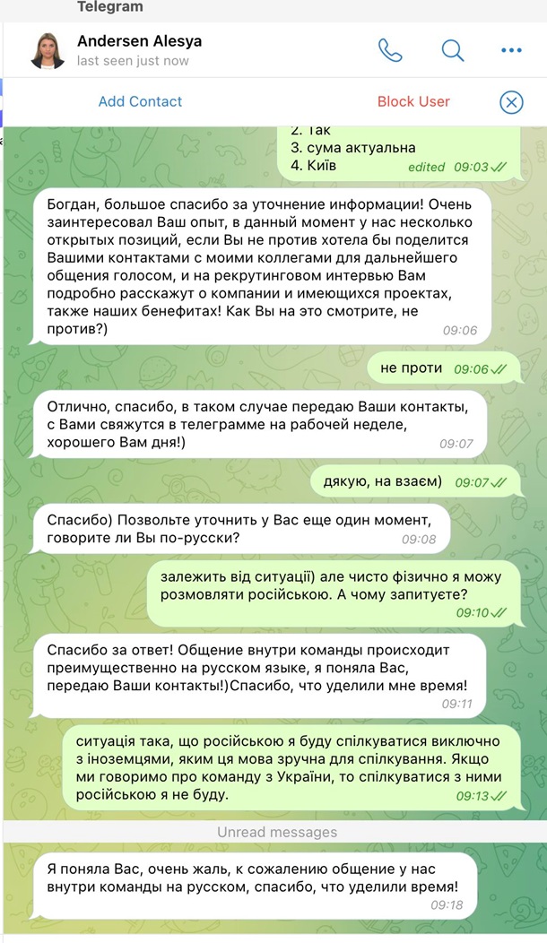 В похожую ситуацию попал еще один украинский разработчик – Богдан Смирнов. Инцидент с ним произошел в декабре 2021 года. IT-специалист разместил скриншот своего диалога с HR-менеджером Andersen в Linkedin и Facebook, а в комментариях журналистам подробнее рассказал о сложившейся ситуации.