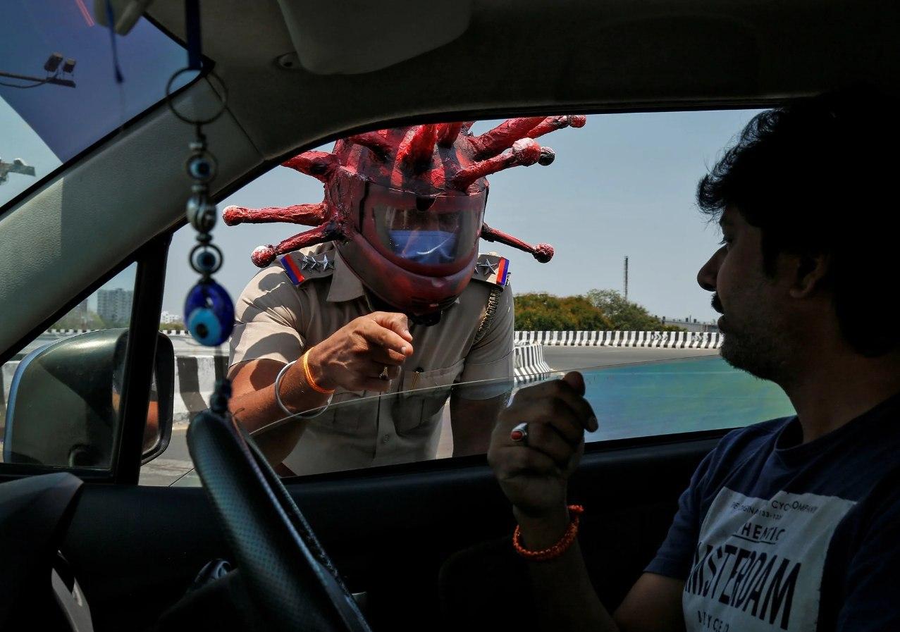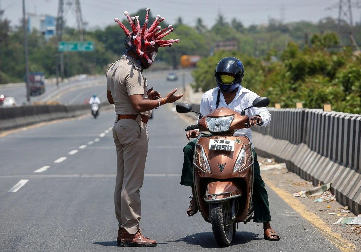 В Индии внимание к проблеме коронавируса привлекают по-своему. Полицейский Раджеш Бабу из города Ченнаи во время патрулирования надевает шлем, изображающий модель коронавируса.