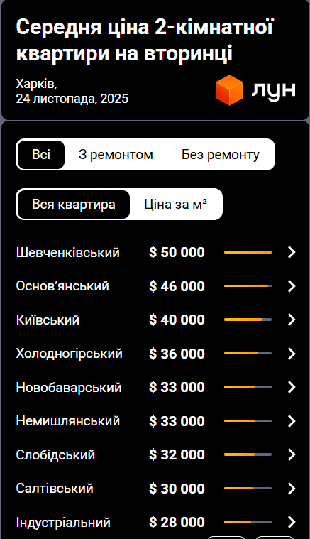 Самые дорогие квартиры в Шевченковском, Основянском и Киевском районах. Соответственно, средняя цена 50, 46 и 40 тысяч долларов. В Индустриальном районе – самые дешевые, около 28 тысяч долларов.