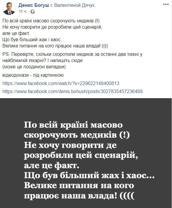 О том, что медиков массово увольняют, на своей странице в Фейсбуке пишет известный украинский политтехнолог Денис Богуш, передает Politeka.