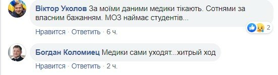 В комментариях к посту Богуша пользователи рассказывают о том, что медики сотнями уходят сами по собственному желанию, а Министерство здравоохранения нанимает студентов.