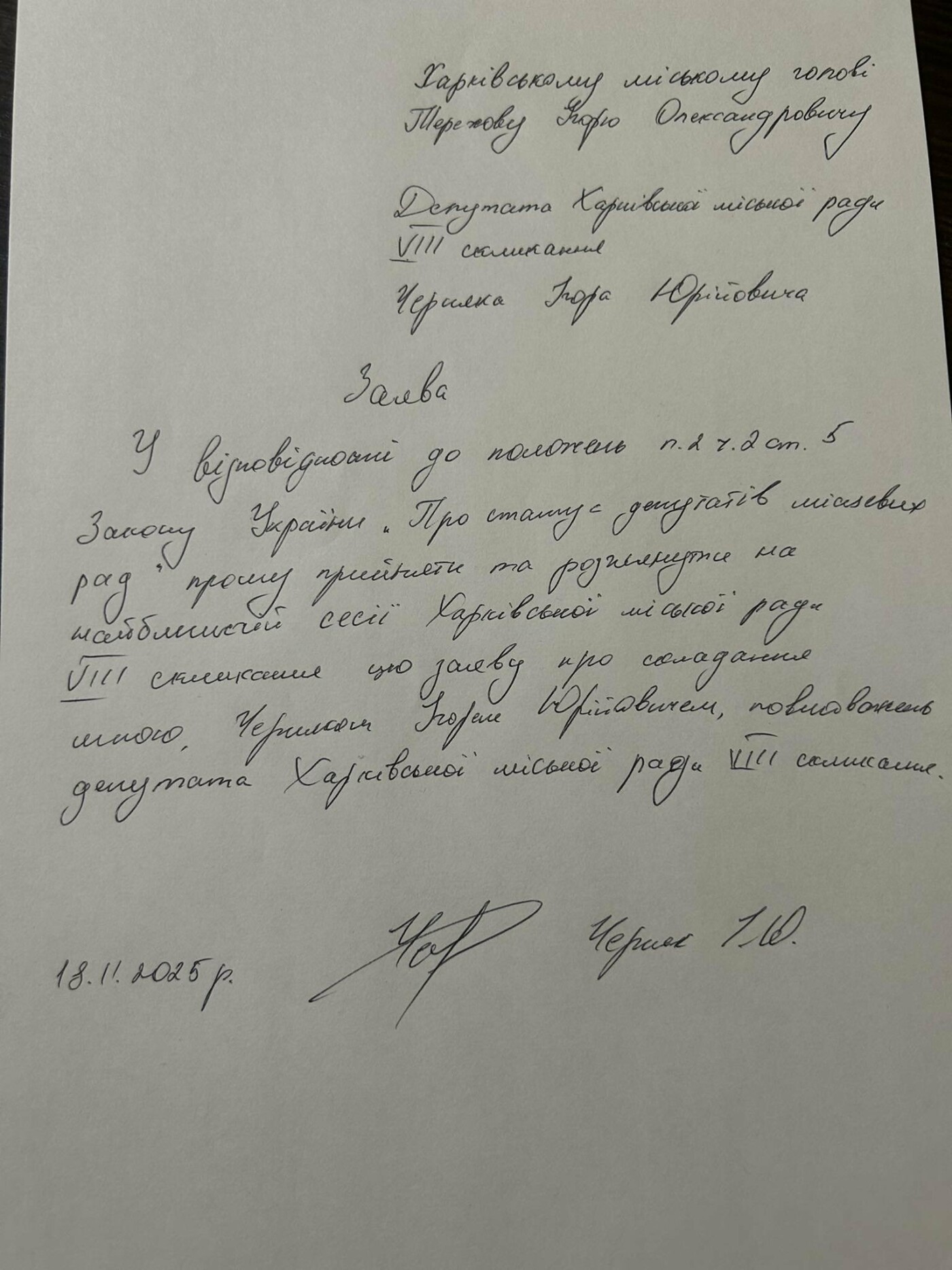 Депутат Харьковского горсовета от Блока Светличной "Вместе" подал заявление о прекращении полномочий.