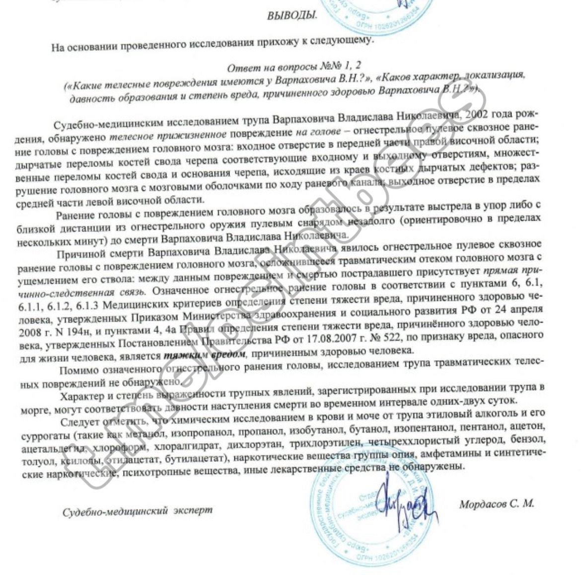 З результатів психолого-психіатричної експертизи випливає, що Владислав «перебував у негативному психічному стані, що могло характеризуватись високим ступенем емоційної напруженості, внаслідок переживання ним внутрішнього особистісного конфлікту з відчуттям неможливості продовжувати жити».