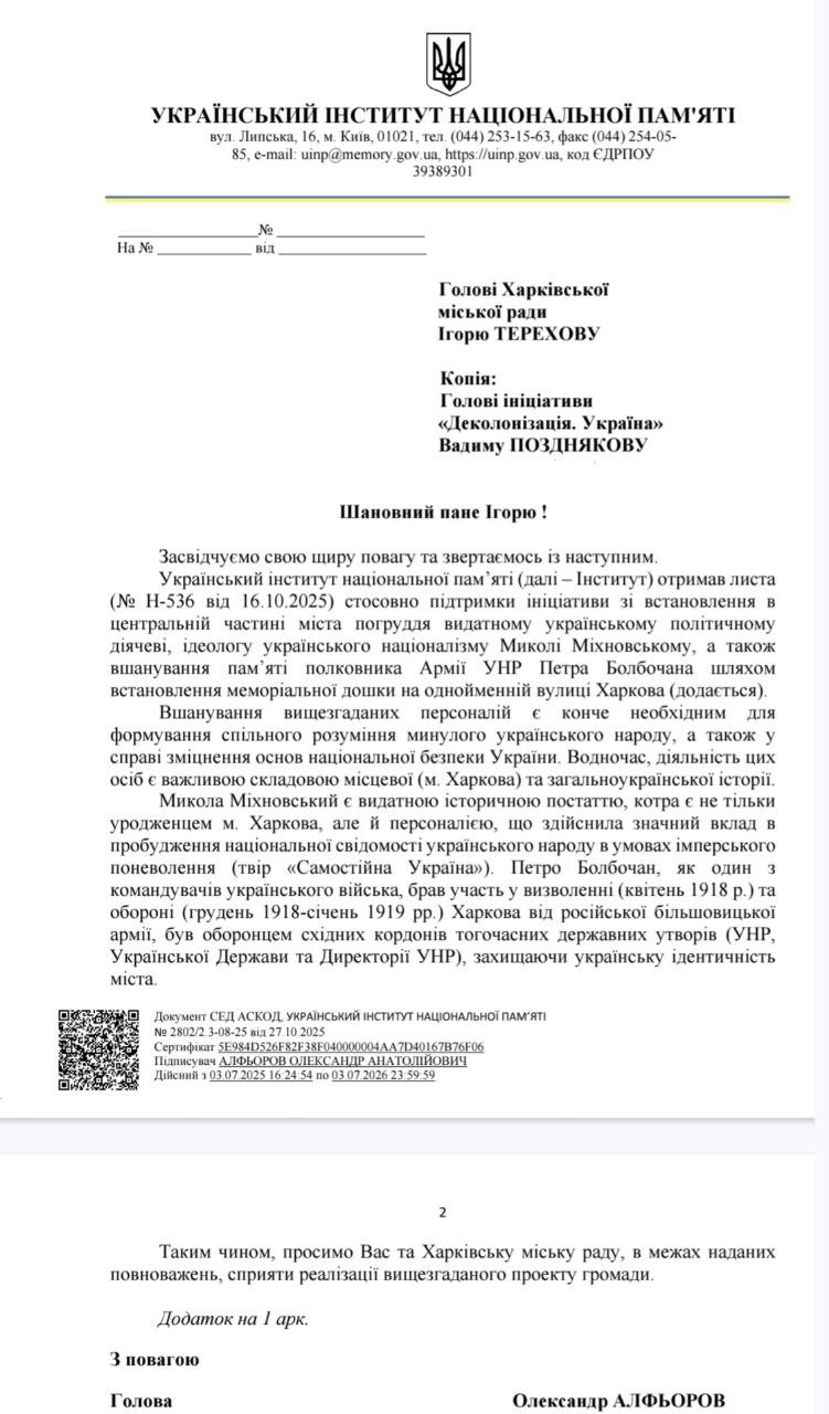 Украинский институт национальной памяти обращусь с письмом поддержки в Харьковский городской совет относительно нашей инициативы о необходимости установления в городе бюста Николаю Михновскому и доске Петру Болбочану.