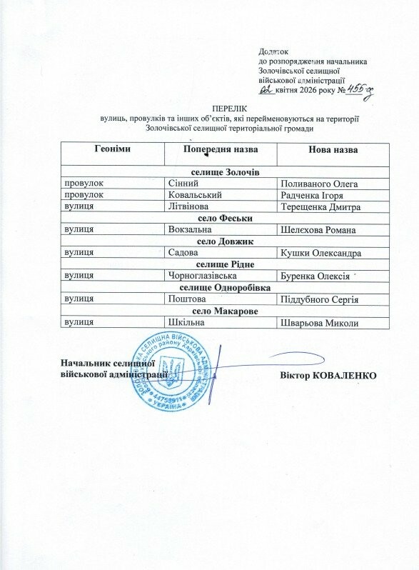 Работа проводилась по инициативе родных погибших Героев-земляков и с учетом мнения жителей. В течение двух месяцев, с 12 января по 12 марта 2026 года, в Золочевской общине продолжалось обсуждение переименования 8 местных топонимов.