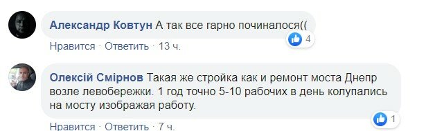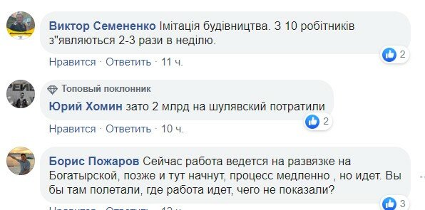 «Сейчас работа ведется на развязке на Богатырской, позже и тут начнут, процесс медленно , но идет. Вы бы там полетали, где работа идет, чего не показали?», «зато 2 млрд на шулявский потратили», «Имитация строительства. С 10 рабочих на работу являются 2-3 раза в неделю.», «Такая же стройка как и ремонт моста Днепр возле Левобережки. 1 час точно 5-10 рабочих в день ковырялись на мосту изображая работу.», «А так все хорошо начиналось», – пишут в сети.