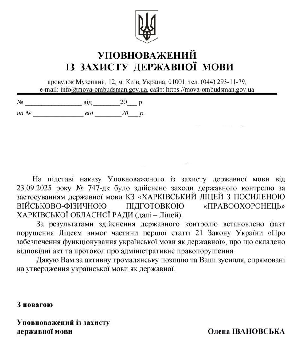 Коммунальное заведение Харьковского областного совета "Харьковский лицей с усиленной военно-физической подготовкой "Правоохранитель" получило протокол за админправонарушения. Речь идет о нарушении языкового закона.