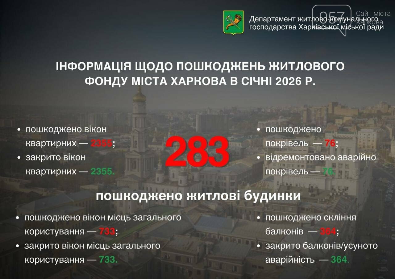 Начало 2026 года вновь принесло Харькову значительные разрушения жилищного фонда в результате вражеских ударов. Только за январь к уже зафиксированным 9300 поврежденным домам добавилось еще 283. Кроме этого, за месяц в городе выбило почти 3,5 тысячи окон.