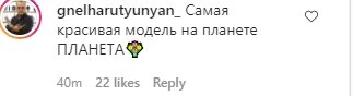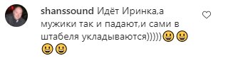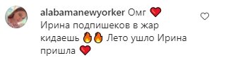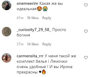 "Мой персик. Очень горячо"; "Самая красивая модель на планете"; "Какая же вы идеальная😍😭"; "Просто богиня"; "У меня такой же комплект белья ! Лямочки очень удобные ! И вы Ирина прекрасны ♥️🔥"; "Брэдли Купер и CR7 должны быть не в своем уме; Я все еще пытаюсь понять это … заметьте, у нее есть ребенок 🔥"; "Королева"; "Моя любимая модель. Невероятная Ирина"; "Серьезно … Что это за цыпочка !?"; "Ирина подписчиков в жар кидает 🔥🔥 Лето ушло — Ирина пришла ❤️"; "Ох, даже при том, что у нее тело большой леди, она все равно милая"; "Идёт Иринка,а мужики так и падают,и сами в штабеля укладываются)))))😃😃😃😃".