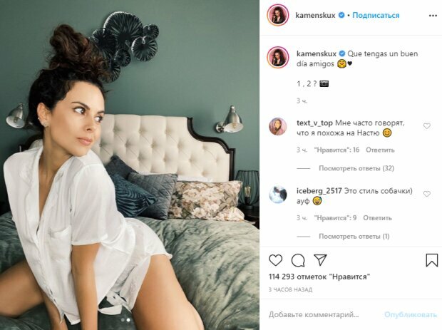А в этот раз Настя похвасталась снимками в провокационной позе. На новых фото в Инстаграм Настя запечатлена с легкой улыбкой на лице и ярком виде. Звезда позирует на кровати в белоснежной пижаме — рубашке и мини-шортах. Волосы она собрала в небрежный пучок, а на лицо нанесла легкий макияж. Каменских слегка наклонилась вперед, сидя на коленях, и посылает поцелуй на камеру.