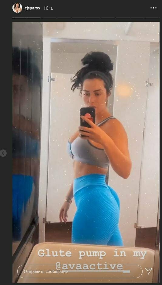 На фото Кассандра позировала в синих лосинах и крохотном топе. Красотка стояла перед зеркалом и демонстрировала свою фигуру, развернувшись боком. На фото можно легко оценить пятую точку звезды, а также ее пышный бюст.