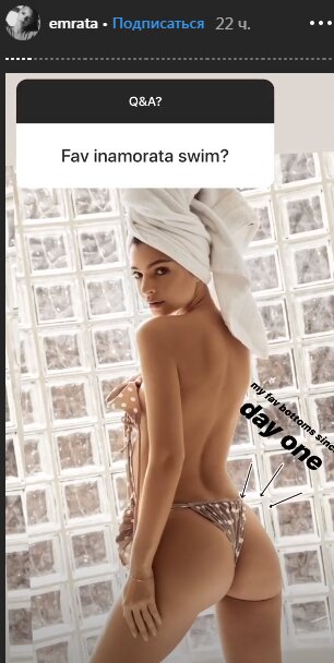 Сториз Эм просто переполнены кадрами откровенного содержания — сейчас многие звезды в связи с карантином, видимо, постят и заливают в сториз архиные кадры. Так на одном из своих фото Эмили с полотенцем на голове в стрингах позирует на камеру. Свой верх купальника при этом она небрежно держит рукой, прижав к себе.