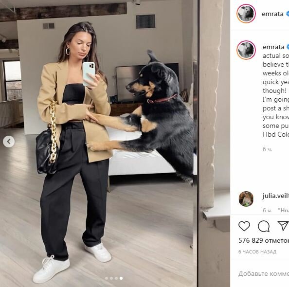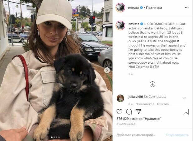 "Коломбо единственный! Наш будто родной сын и ангелочек. Я до сих пор не могу поверить, что он вырос с 13 фунтов в 8 недель до примерно 80 фунтов за один быстрый год. Он все еще самый уютный! Он делает нас самыми счастливыми, и я воспользуюсь этой возможностью, чтобы опубликовать кучу его фото…", — подписала фото артистка.
