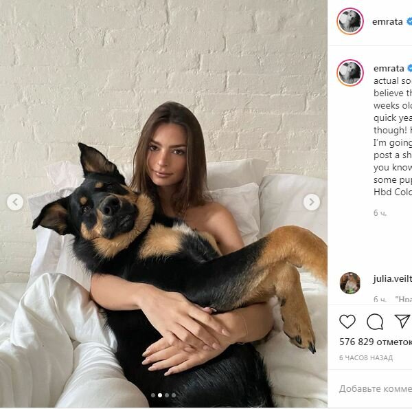 На других фото Коломбо предстал уже повзрослевшим. Так, на одном из кадров Эмили находится на белой постели, а пес запрыгнул к ней на руки будто щенок. Собака смотрела в камеру, позируя с любимой хозяйкой.