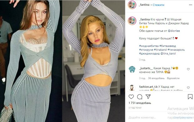 «Какая Хадид? Конечно же Тина», «У Хадид без шансов», «тут без вариантов,конечно же Тина», «На Джиджи потрясающе сидит, но формы Тины меня сводят с ума, выглядит сексуально, подчеркивает все ее достоинства», «Джиджи прости но это платье тебе не подходит 😂😂. Тина можете учавствовать в неделе моды», — пишут они.