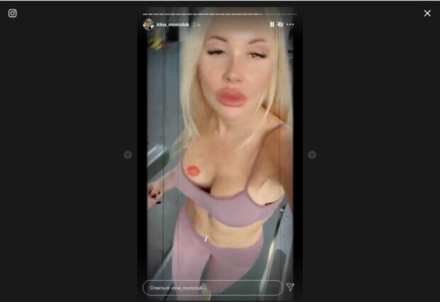 Морозюк крутилась возле зеркала, соблазняя своими выдающимися формами. На зоне декольте красовалась знаменитая татуировка Ирины в виде отпечатка губ.