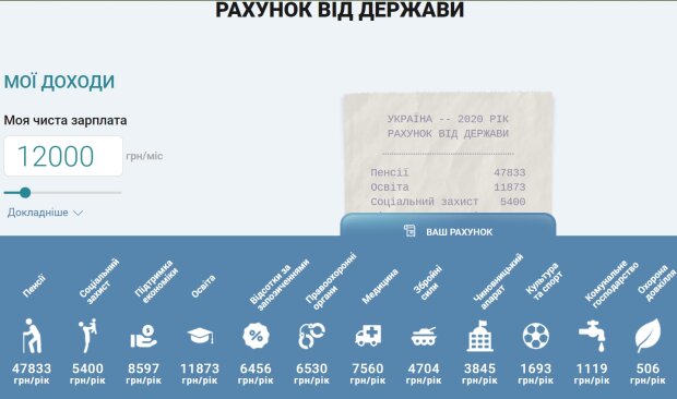 Если украинец получают среднюю по стране зарплату в размере 12 тысяч гривен в месяц, то годовая сумма налогов оставит 106,1 тысячу гривен, из них 47,8 тысяч гривен за год отправятся Пенсионный фонд. Еще 11,873 гривны уйдет на образование, 5,4 тысячи — на соцзащиту, 4,7 тысячи — на украинскую армию, 7,56 тысячи — на медицину, 8,6 тысячи гривен — на поддержеку экономики и почти 6,5 тысячи — на выплату процентов по государственным займам. При этом среднестатистический работник должен заплатить на содержание чиновников 3,8 тысячи гривен.