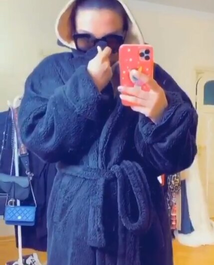 В дальнейшем Анна "укутывалась" по наростающей, надевая все больше и больше одежда. Дошло до того, что эпатажная артистка показала себя в меховой шубке поверх синего махрового халата, который, в свою очередь, натянула на спортивный костюм. Кроме того, она была в капюшоне и солнцезащитных очках.