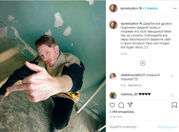 «Давайте все дружно поднимем средний палец и покажем его этой невидимой бяке! Нас не сломать! Соблюдайте все меры безопасности! Берегите себя и своих близких!», — написал артист, намекая на распространившийся коронавирус.