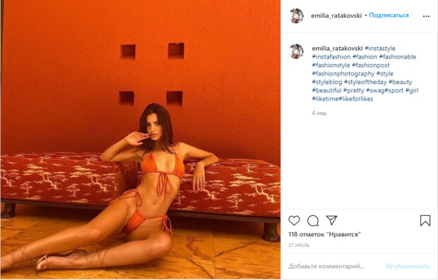 В этот раз стройная красотка покорила образом в ярком купальнике оранжевого оттенка. Эмили позировала в модном бикини с тонкими завязочками на груди и бедрах. При этом, чтобы подчеркнуть свои достоинства, девушка уселась на пол возле софы и выставила стройные ножки вперед.
