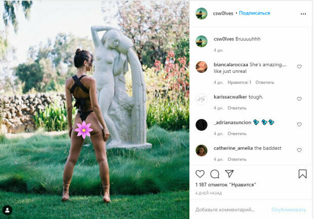 Ранее жаркий кадр, на котором Эмили позировала спиной к объективу и показала ягодицы во всей красе тут же стал центром обсуждения фигуры звезды. Многих удивляет упругая и ровная кожа Эмили. Причем сама она высказывается о питании просто: