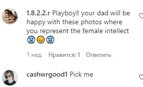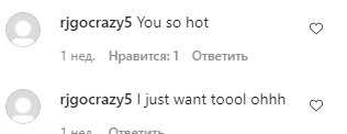 «Wooooow😍😍😍😍», «Это очень сладко🙌», «черт возьми, это круто», «И небеса можно желать», «Ты такой горячий малыш», «Я просто хочу слишком много оооо», «Можно смотреть бесконечно😍😘😘», «Удали все и иди ко мне, детка», «Плотину прорвало», «Не позволяй @brawadis это увидеть» «Пора в Playboy‼ ️ твоему папе понравятся эти фото, где ты олицетворяешь женский интеллект», «Непослушная красавица❤️»,