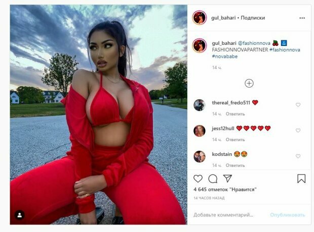 В этот раз Бахари позировала в красных штанах и кофте, похожих на спортивный костюм, которую решила оставить расстегнутой. Красавица таким образом показала свои пышные формы, которые еле влезли в красный купальник. Гюль присела посреди дороги на корточки и отвела взгляд от камеры. Кадр получился очень интересный и соблазнительным.