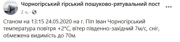 "По состоянию на 13:15 24 мая 2020 года на горе Поп Иван Черногорский температура воздуха +2°С, ветер юго-западный 7м/с, снег, ограниченная видимость до 70 метров", – предупредили в сообщении.