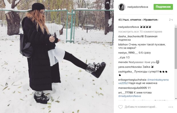 Надя Дорофеева закрывает тройку. Звезда была в длинной куртке и ботинках. Образ красотка дополнила шапкой, а на плече можно увидеть сумки. Певица гуляла по улице среди снега.