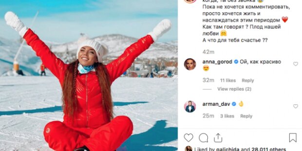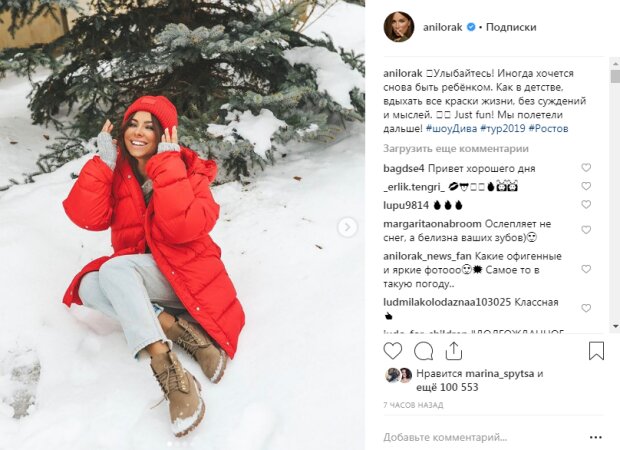 Закрывает топ Анна Седокова. Красотка сидела в красном костюме и белой шапке с варежками. Девушка отдыхала на горнолыжном курорте, как можно заметить. Певица села на лыжной трассе и подняла руки вверх,. позируя для фото.