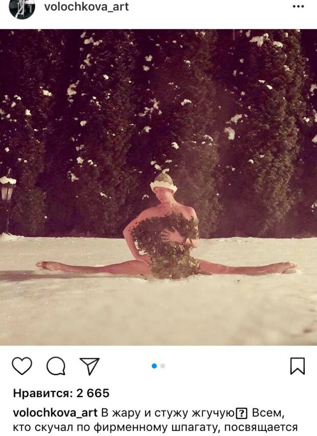 На втором фото можно увидеть Анастасию Волочкову. Звезда была совсем раздета, только шапочка на голове спасала от холода. Балерина села на шпагат прямо на снегу, раздвигая максимально ноги. Кадр получился эффектным и странным.