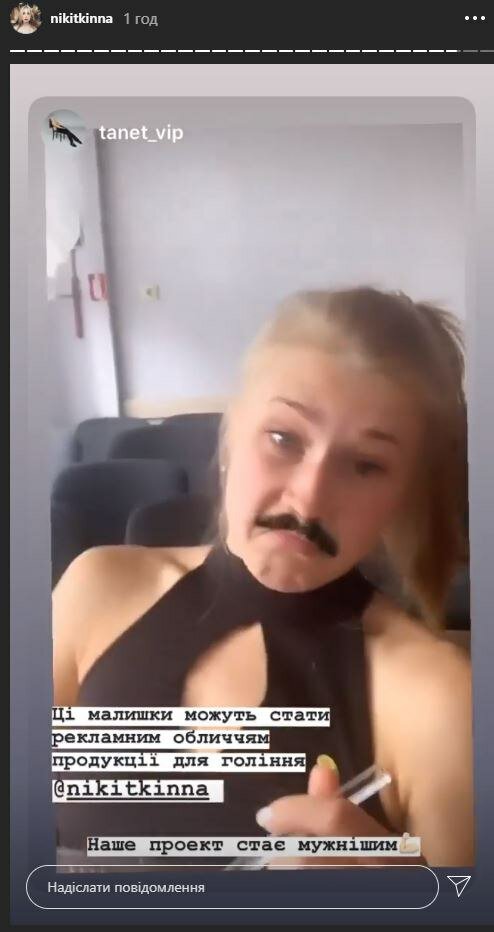 На втором кадре Никитина уже была в черной одежде и сидела в актовом зале. Все бы ничего, но у красотки появились усы, которые пририсовали фильтром. Кадр получился смешным и светлым.