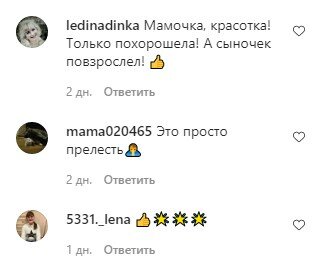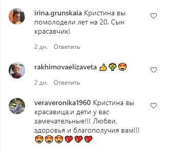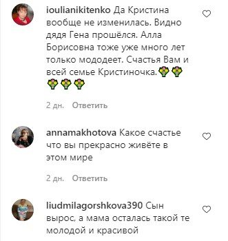 "Мама красотка, с возрастом всë краше! КРИСТИНА ЕЩЁ КРАСИВЕЕ СТАЛА!!!!💯💯💯💯👏👏👏👏 Замечательные фотографии👍👍👍 Дети взрослеют, а мамы молодеют!👍👏 Кристина вы помолодели лет на 20. Сын красавчик! Кристина вы красавица,и дети у вас замечательные!!! Любви, здоровья и благополучия вам!!!😍😍😍💖💖💖 Мамочка, красотка! Только похорошела! А сыночек повзрослел! 👍 Это просто прелесть🙏 👍🌟🌟Не то что не изменилась. А ещё больше помолодела. Сын повзрослел, а мамочка помолодела Мама стала моложе, а сынок вырос и почти ровесник маме👏👏 Да Кристина вообще не изменилась. Видно дядя Гена прошёлся. Алла Борисовна тоже уже много лет только мододеет. Счастья Вам и всей семье Кристиночка.💐💐💐💐💐 Какое счастье что вы прекрасно живёте в этом мире Сын вырос, а мама осталась такой те молодой и красивой Кристина стала на 10 лет моложе, а Дени явно старше", – пишут люди.