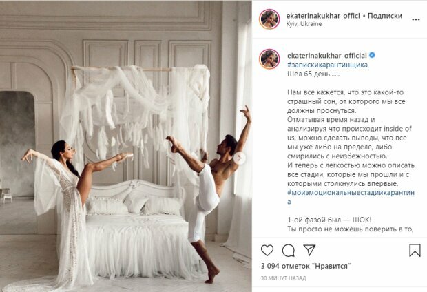 Ранее мы писали, что Екатерина Кухар поделилась невероятным снимком с мужем Александром Стояновым. Они застыли в танцевальных позах около огромной белоснежной кровати.
