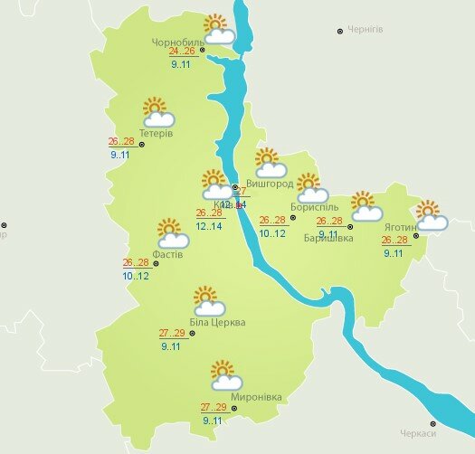 В Киеве и области синоптики из Укргидрометцентра прогнозируют от 26 до 28 градусов со знаком «плюс», а ночью около 9-11 тепла. Дождей не предвидится.