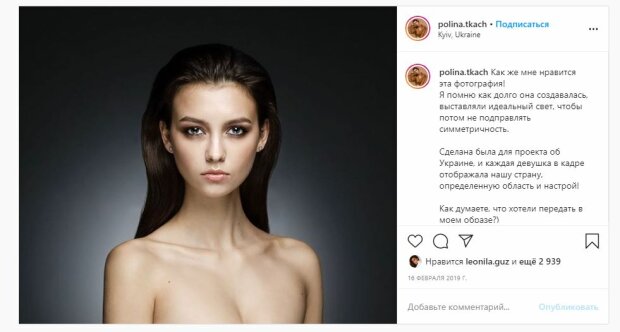 "Мисс Украина 2017" Полина Ткач решила показать себя вообще без одежды, но только по грудь. На фото модель смотрит в камеру и можно увидеть частично ее обьемы, а нижняя часть фото была обрезанной.