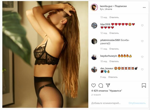 На втором кадре уже Леонила Гузь, "Мисс Украина 2018", которая была в кружевном белье и колготках. Модель позировала в профиль и запрокинула волосы назад, взявшись за голову руками. Это придало снимку особой сочности, которая зажигает не только сердца.