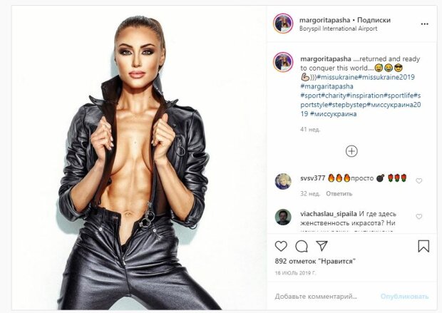 На следующем кадре Маргарита Паша, "Мисс Украина 2019", что стояла в кожаной куртке и штанах. Девушка расстегнула верхнюю одежду и оказалось, что там нет белья, поэтому оценить можно не только пресс.
