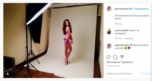 Александра Кучеренко взяла титул "Мисс Украина" в 2016 году. Девушка на одномм из фото показала, как готовилась к тому выступлению. Звезду снимали в синем купальнике на белом фоне. Можно оценить прекрасную фигуру модели, которую она продемонстрировала не стесняясь.