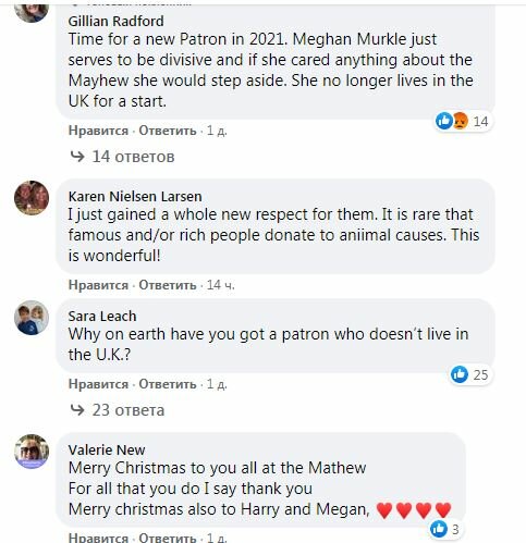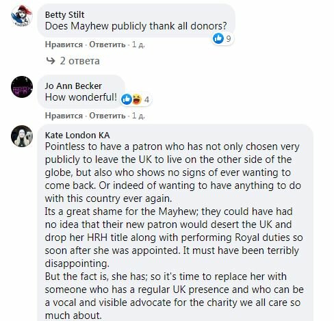 "Благодарит ли фонд всех жертвователей публично?", "Почему у вас есть покровитель, который не живет в Великобритании?", "Бессмысленно иметь покровителя, который не только публично решил покинуть Великобританию и жить на другом конце земного шара, но и не подает никаких признаков желания когда-либо вернуться", "Замечательно, что они отправили открытку и сделали пожертвование. Надеюсь, это было очень щедро", "Вам нужно сменить покровителя, она вызывает разногласия", " Жаль, что она использует благотворительность только для того, чтобы сохранить интерес к Великобритании. Я чувствую, что благотворительность используется", — написали пользователи в комментариях.