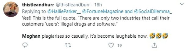"Да!! Вот полная цитата. "Существует только две индустрии, называющие своих клиентов users: запрещенные наркотики и программное обеспечение", "Боже, Меган заплатили, чтобы она выступила на конференции и высказала идею "Социальной дилеммы" о том, что пользователи соцсетей похожи на наркозависимых, и при этом она говорит, что не пользовалась соцсетями уже четыре года? А блог The Tig? А страница Sussex Royal в Instagram? Twitter? Лгунья", "Меган так начала копировать чужие идеи, что это вызывает лишь смех", — возмущались пользователи, комментируя выступление Меган Маркл на онлайн-конференции.