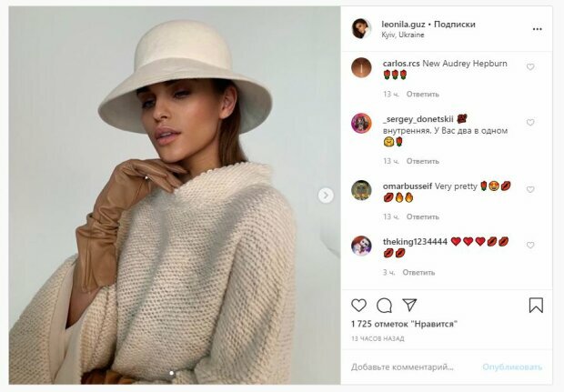На фото Леонила позировала в вязаном свитере, кожаных перчатках и шляпке. Волосы у Гузь были распущены в этот раз. На фоне ничего не было видно, так как снимок был студийным. Кадр получился очень стильным и нежным, хотя и не таким соблазнительным, как другие кадры звезды.