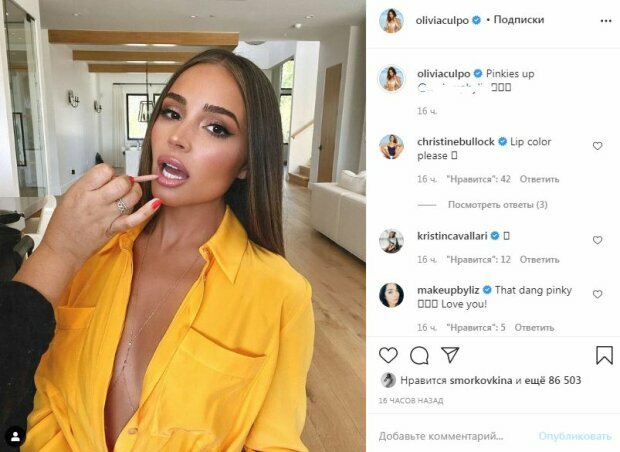 Ранее мы писали, что Оливия Калпо позировала в желтой рубашке, которую кокетливо распахнула. Под одеждой не оказалось белья, что было видно невооруженным взглядом. При этом в декольте можно было заметить длинную золотую цепочку, которая также соблазнительно подчеркивала груди.