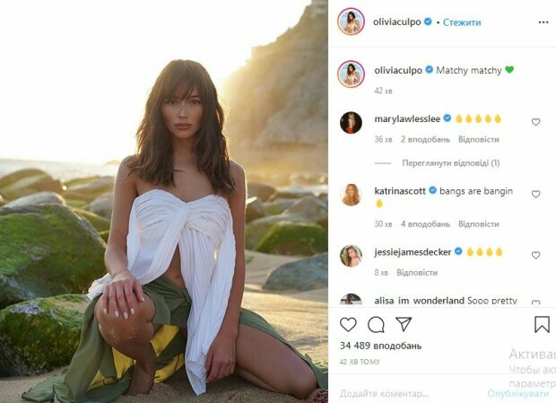 Напомним, Оливия Калпо предстала сидя перед камерой на фоне пляжа, элегантно расставив ноги. При этом знаменитость заглядывает в объектив, излучая женственность и красоту.