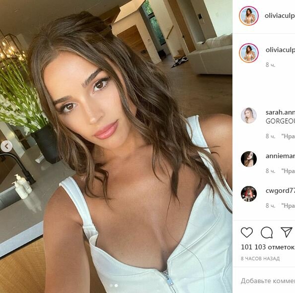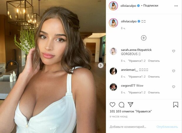 Калпо сделала селфи, немного приподняв камеру. Оливия засветила пышную грудь в белом топе со смелым декольте. Ткань натянулась на больших бретельках и грудь сжалась, будто одежда была уж очень узкой.