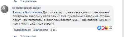 "Пусть хоть кто построит, у самих руки из жо**", "Было бы замечательно, если бы наконец проблемы мусора на Украине сдвинулись с места, а то скоро утонем в мусоре", "А у самих руки из жопы, или как?", "А сами что, не можем? Или руки не из того места растут?", "Да что же за страна такая, мы что не можем построить заводы у себя сами? Все буквально западные страны лезут нам помогать, а расплачиваемся мы…. Так потихоньку они нас и уничтожат, как страну", " Может они нам помогут, а то наши многострадальные построить не могут", — писали пользователи сети.