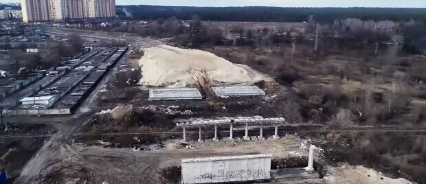 Сюда завезли тонны песка и щебня. Отметим, что участок будущей дороги от ул. Богатырской в направлении Оболонского проспекта и проспекта Героев Сталинграда ныне полностью погряз в мусоре. Киевляне на этом месте образовали большую несанкционированную свалку.