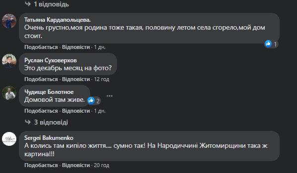 "Мое родное село. Также имею фото 2018 с этого порога", "Избушка бабы Насти, на хуторе Загряззя села Ладыжичи", "Очень грустно, моя родина тоже такая, половина села летом сгорело, мой дом стоит","А когда там кипела жизнь… грустно так! На Народиччине Житомирщины такая же картина!", — писали украинцы под постом.